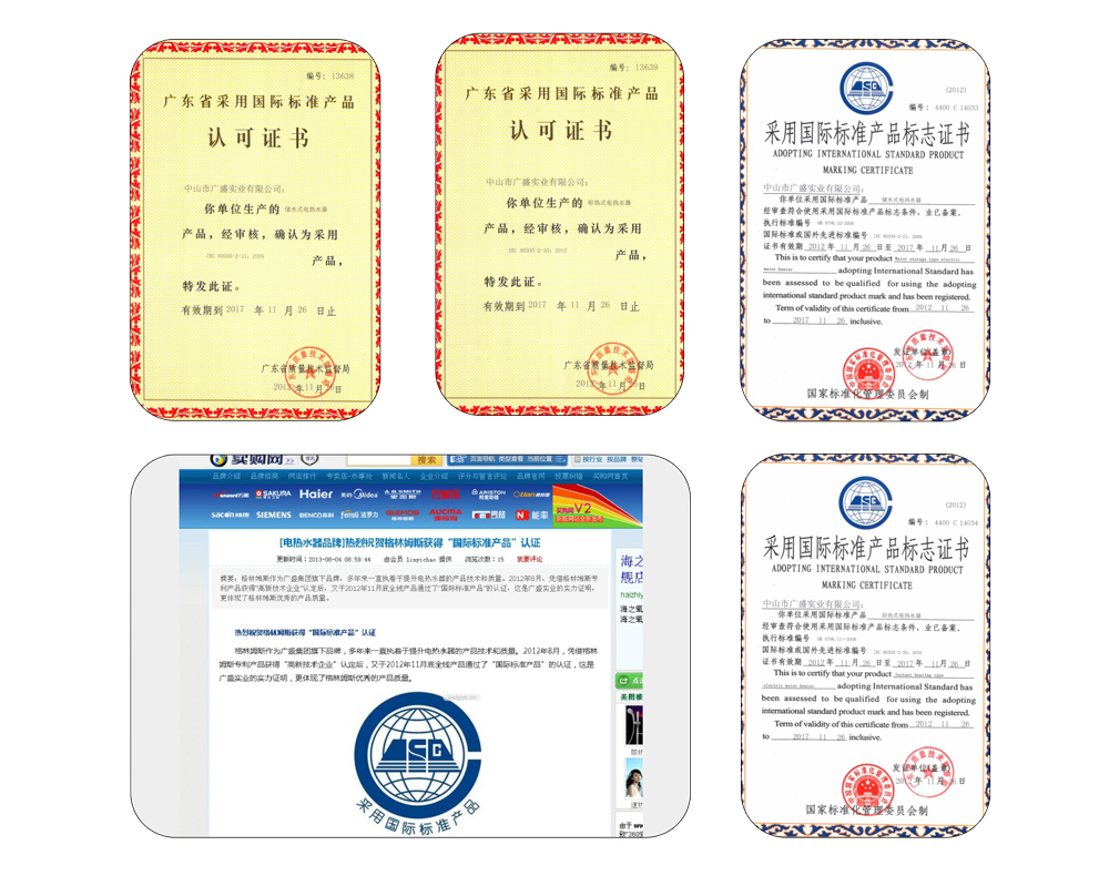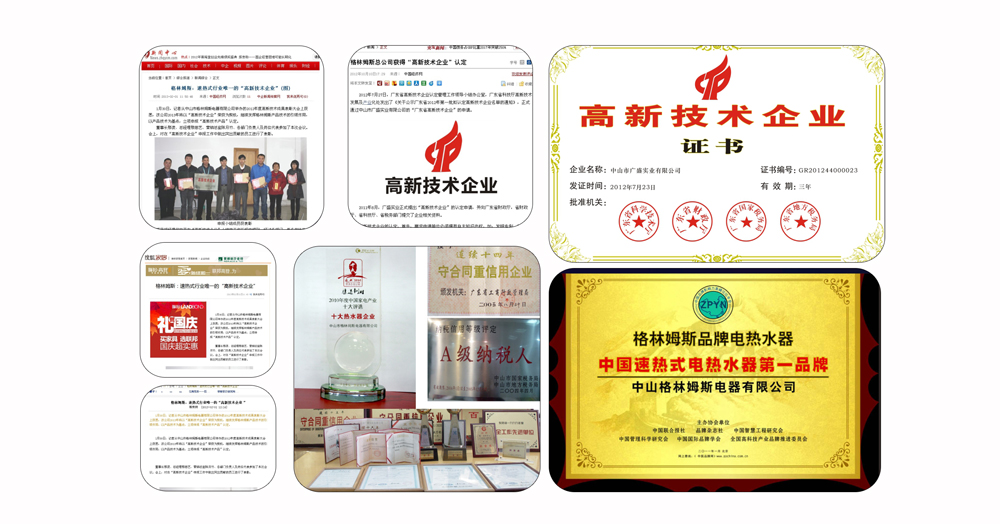 | 2011年1月,格林姆斯在人民大会堂被多家权威机构授予“中国速热式电热水器第一品牌”荣誉; |