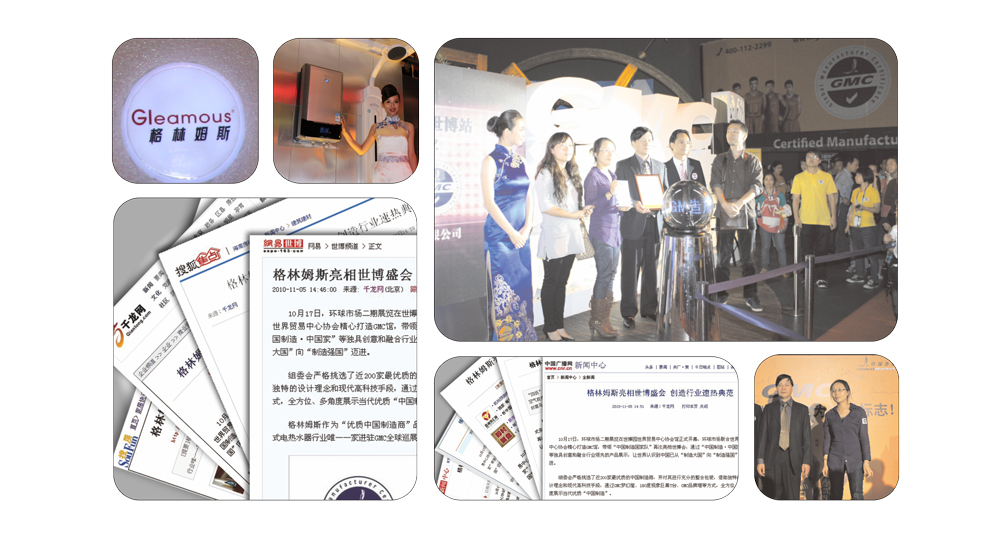 2010年10月,格林姆斯携手环球市场亚洲集团,成功进驻上海世博会世界贸易中心协会逛GMC梦幻屋, 成为唯一一个进驻上海世博会的速热式电热水器品牌。 |