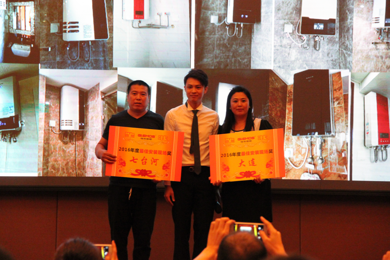 为了答谢广大合作伙伴在2016年以来的大力支持,广东格林姆斯电器有限公司在本次年会中为各大优质经销商和客户、员工设立了一系列的奖项。广东格林姆斯电器有限公司总经理黎翊喬小姐和市场总监何柏坚先生分别为获奖者颁发了奖项。